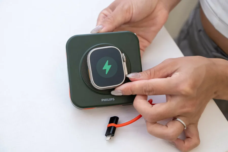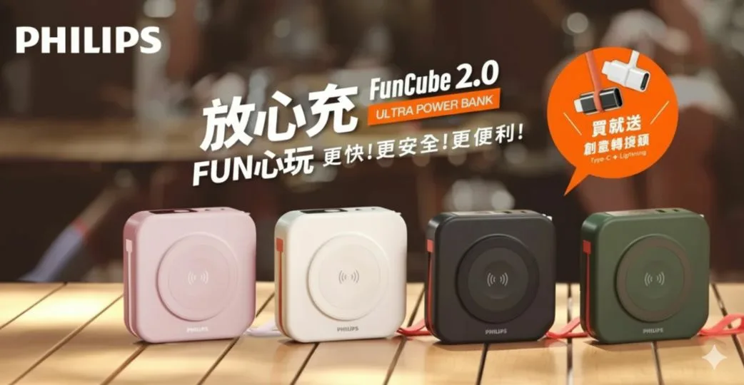 PHILIPS FunCube 2.0放心充也保有直覺化的充電介面顯示、好提好掛的便利提把,以及快速收闔的手機支架,追劇更加輕鬆。而PHILIPS放心充系列產品在安全上絕不妥協,具備獨家溫控晶片、1.2m抗摔測試與充滿電自動斷電等保護機制,同時加保4000萬產品險,要讓消費者用得安心。