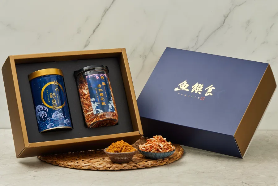 魚饌食禮盒用深海藍寶石黃鰭鮪魚作為誠摯心意,這款禮盒也將台灣珍寶-紅寶石櫻花蝦放入,讓送禮不僅美味、營養,更能表現出大方體面的用心。