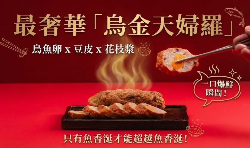 迎接馬年新春,魚香涎再度跨界聯手名店「呷七碗」,推出升級版「烏魚子干貝米糕」,今年份量加大至 1000 克,口感更Q彈、海味更濃郁;獨家奢華新品「烏金天婦羅」以整顆烏魚卵包裹花枝漿與豆皮,氣炸、油煎或烤箱烹飪皆宜;熱銷三年的「烏金雪磚餅」也增添切達起司與蔓越莓兩種新口味,採用海藻糖取代棉花糖,整體風味不甜膩。