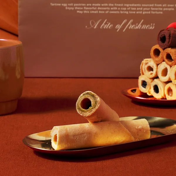 唐緹Tartine年節主打的綜合手工蛋捲,特別選用來自日本的熊本珍珠麵粉製作,粉質細緻、蛋香濃郁,新推出的開心果口味蛋捲,也選用來自義大利西西里島的開心果醬製作,層層酥脆餅皮抹滿濃郁堅果醬,口感紮實、香氣馥郁!手工蛋捲系列更全面添加耐高溫芽孢益生菌、日本NIPPI膠原蛋白,與降甜膩海藻糖,讓過年團圓長輩享用起來更輕負擔。