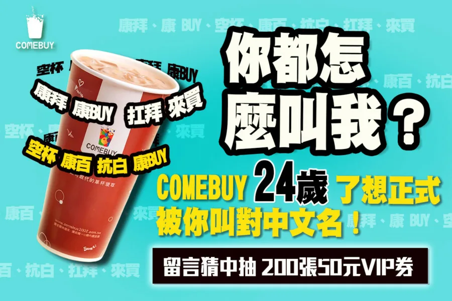 由 COMEBUY 官方社群接力登場,2026年 2 月 25 日至 3 月 10 日推出中文正名抽獎活動 (實際活動辦法,詳見官方粉專說明為主),只要參與互動並猜中有機會每名抽中兩張 50 元 VIP 券(共 100 名)。不只喝茶,還能抽好運,讓新年從互動開始就充滿驚喜。