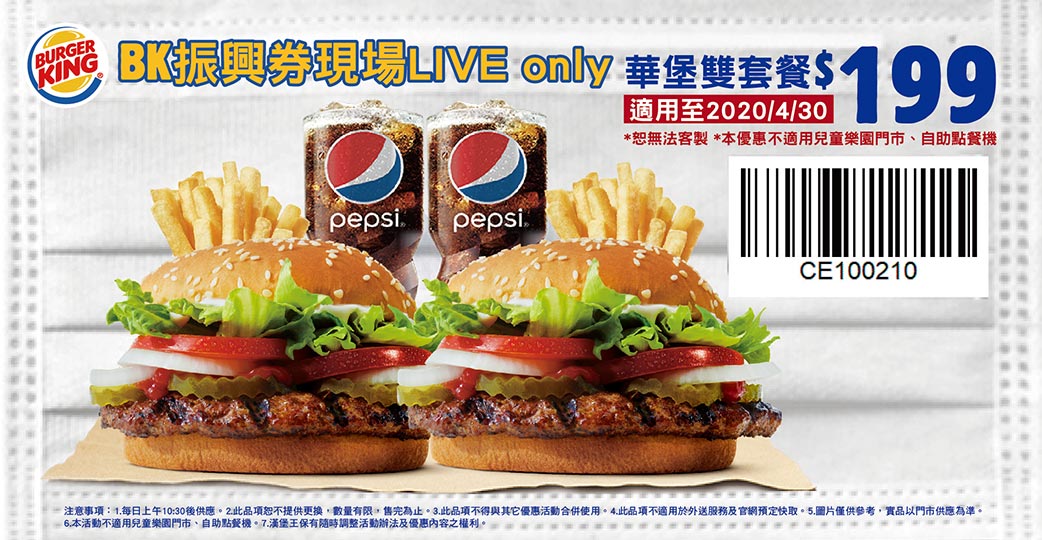 還在為疫情和低迷的景氣煩惱嗎? 搶先政府出手,【BurgerKing 漢堡王】豪氣推出「BK振興券」,經典火烤牛肉、堡迷必buy的「華堡雙套餐」,景氣振興價只要 … 漢堡王振興券就是狂!「華堡雙套餐」二話不說$199優惠給你